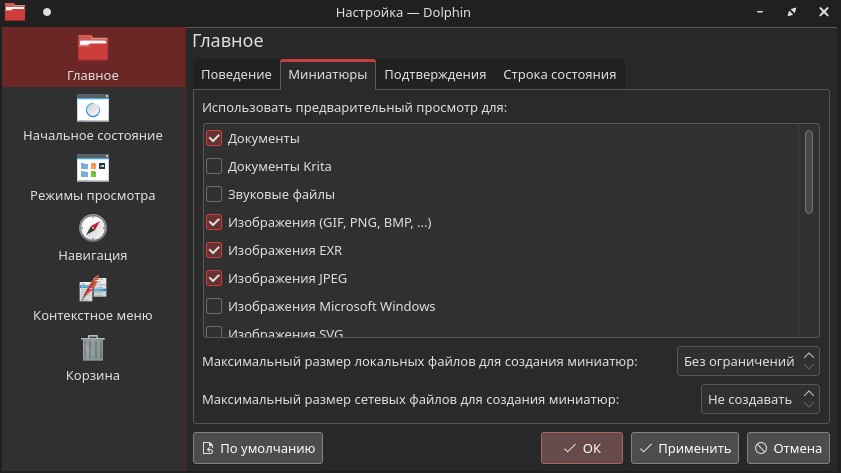В разделе «Режим просмотра» вы можете настроить внешний вид интерфейса Dolphin. Здесь можно изменить размер значков и миниатюр, что особенно удобно при работе с фотографиями. Также можно настроить шрифт и ширину текстовых подписей.