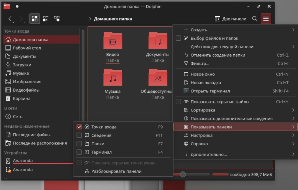 В Dolphin есть список дополнительных панелей: точки входа, сведения, папки и терминал. Вы можете настроить их состав, чтобы необходимые панели были всегда под рукой отображаясь по умолчанию. Просто нажмите на меню в правом верхнем углу, перейдите к пункту «Показать панели» и выберете нужные пункты.