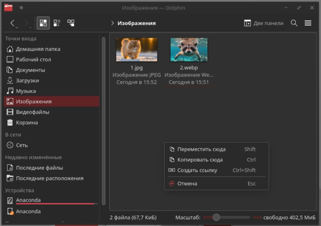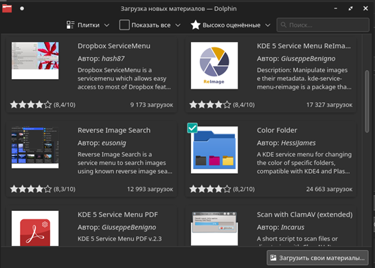 Также Dolphin поддерживает расширения, которые добавляют новые функции в контекстное меню.
