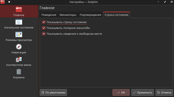 Настройки начального состояния позволяют задавать параметры отображения окон Dolphin при запуске. Здесь вы можете указать параметры отображения по умолчанию при открытии файлового менеджера: