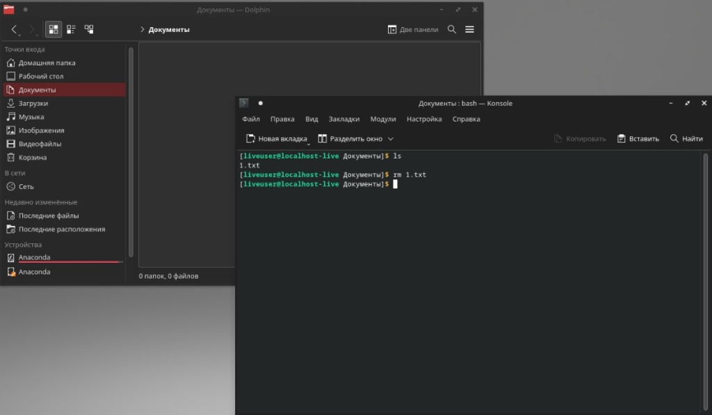 Например, с помощью терминала удалим текстовый файл. Как видите, Dolphin автоматически обновил содержимое папки. Более того, при переходе в другой каталог в терминале графическая часть интерфейса также переместится туда.