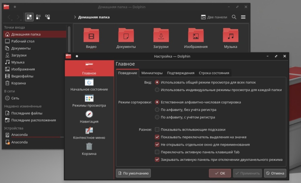 Поведение — выбрать режим просмотра папок, сделать сортировку файлов и настроить дополнительные функции, такие как всплывающие подсказки с информацией о файлах, переключение между панелями клавишей Tab и автоматическое закрытие неактивных панелей.