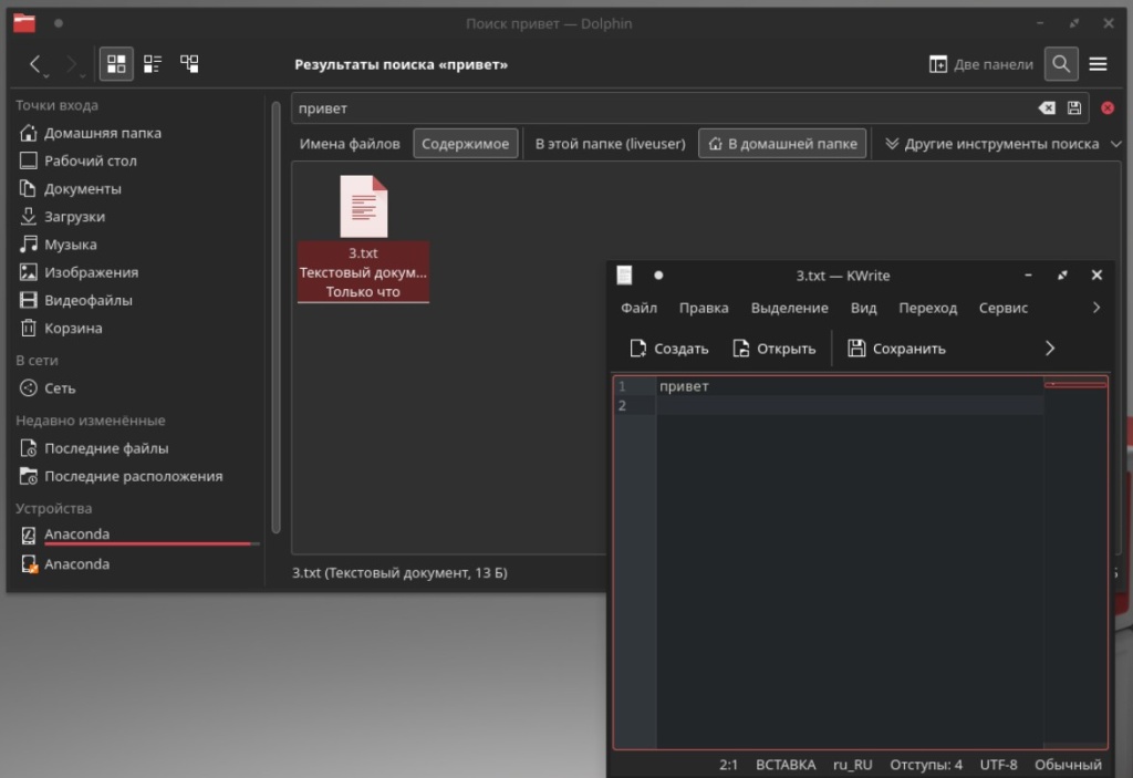 Dolphin умеет искать файлы по имени, расширению и содержимому. Так, в поиск можно ввести текст, и Dolphin найдёт все документы, содержащие данный фрагмент. Больше подробностей о поиске файлов с использованием индексации Baloo рассказали в статье в базе знаний РЕД ОС.