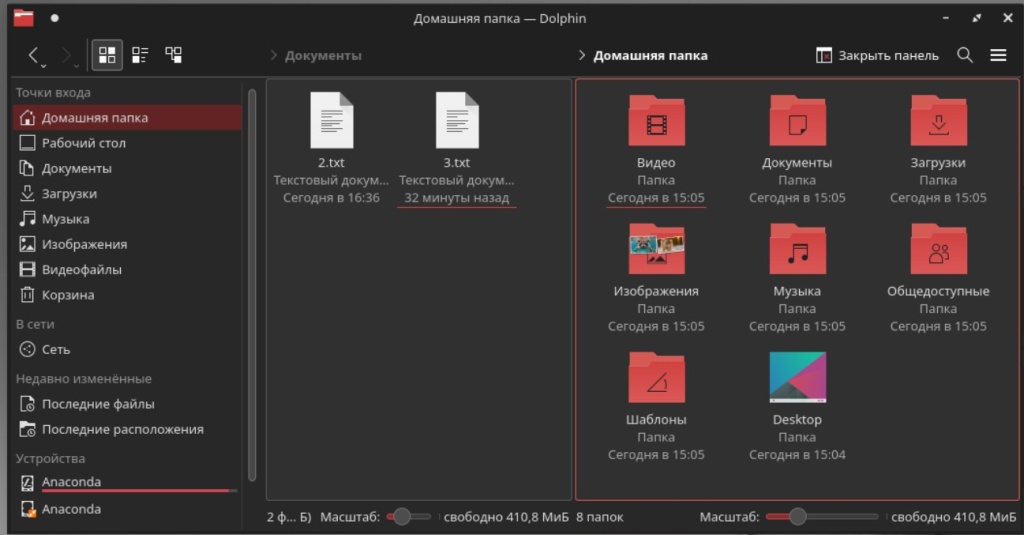Одной из самых известных и удобных функций Dolphin является режим, который позволяет одновременно отображать две рабочие панели.Чтобы активировать его, нажмите на значок «Две панели» в правом верхнем углу или нажав клавишу F3. Теперь вы можете легко перемещать файлы между папками или одновременно просматривать содержимое нескольких папок.