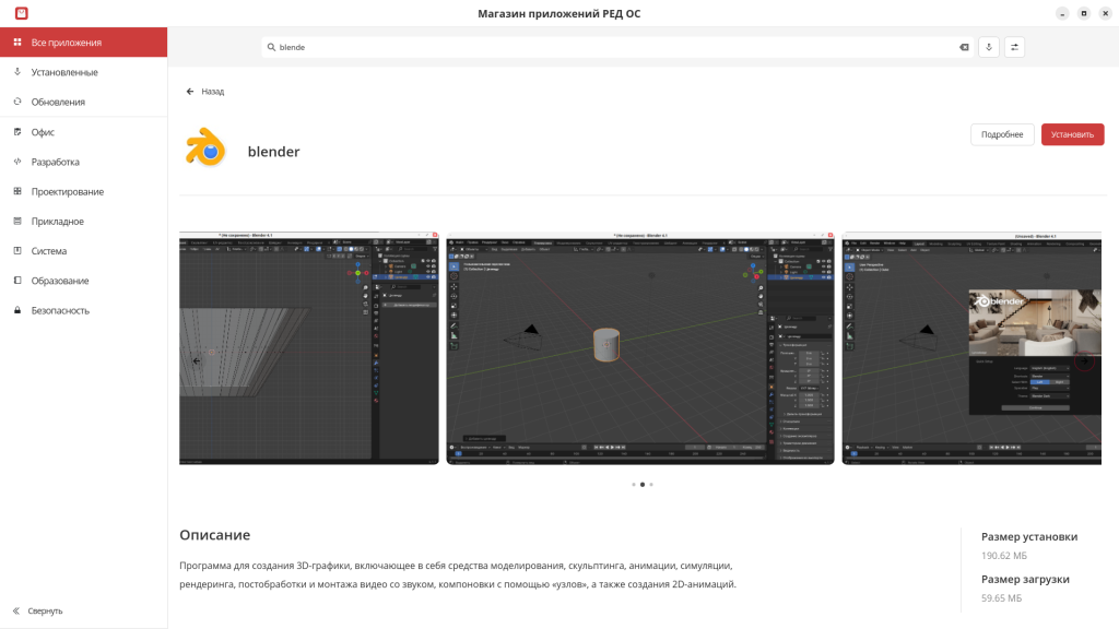 Карточка приложения содержит подробное описание на русском языке, скриншоты и размер приложения. Прямо из карточки можно инициировать установку, удаление или запуск приложения, а также перейти к дополнительным материалам — на сайт проекта или статью в Базе знаний РЕД ОС.