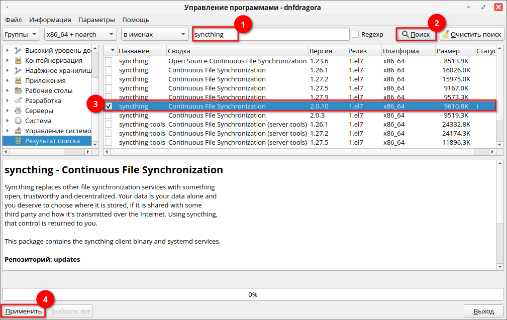 Для установки программы через графический менеджер пакетов dnfdragora перейдите в «Главное меню» — «Администрирование» — «Управление пакетами dnfdragora», выполните поиск необходимого пакета по ключевому слову «syncthing» и отметьте флагом пакет последней версии. После этого нажмите кнопку «Применить» и дождитесь окончания установки.