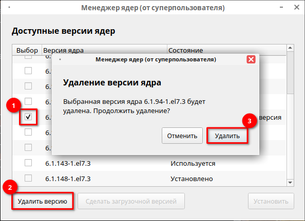 Удалить версию — позволяет удалить любую установленную версию ядра, кроме используемой в данный момент;
