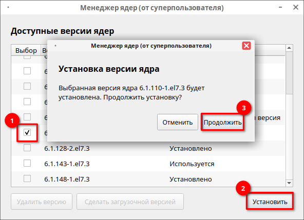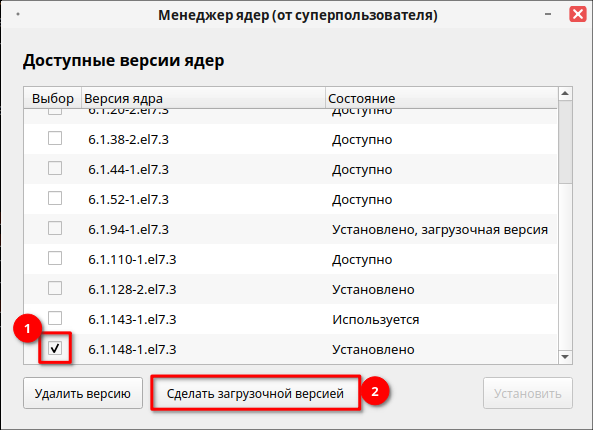 Установить — можно установить любую, еще не установленную версию ядра из списка.