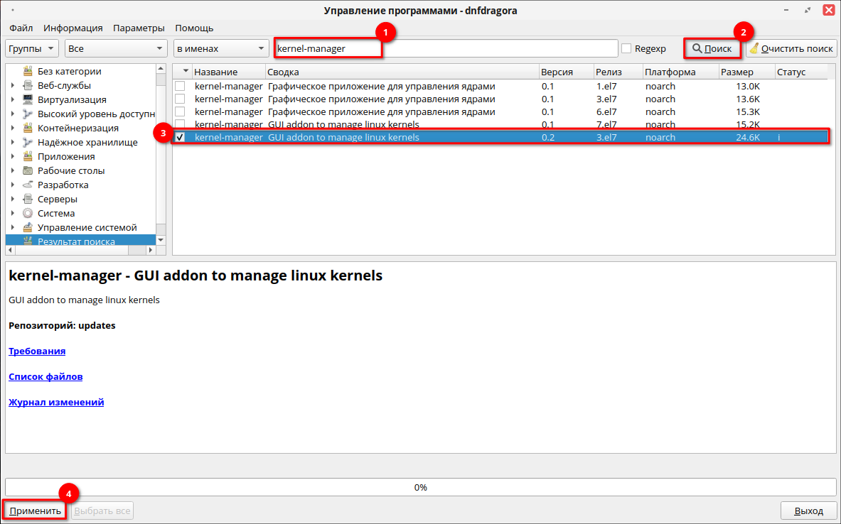 Для установки программы через графический менеджер пакетов dnfdragora перейдите в «Главное меню» — «Администрирование» — «Управление пакетами dnfdragora», выполните поиск необходимого пакета по ключевому слову «kernel-manager» и отметьте флагом пакет последней версии. После этого нажмите кнопку «Применить» и дождитесь окончания установки пакетов.
