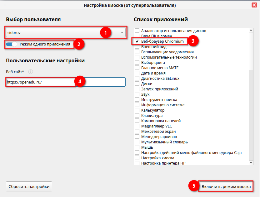 Настройка режима киоска с веб-браузером Chromium в качестве единственного приложения и стартовой страницей онлайн-курсов выглядит следующим образом: