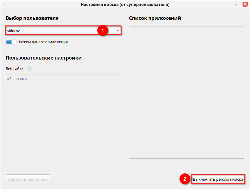Для выключения режима киоска и возврата настроек пользователя к обычному состоянию используется команда kiosk-mode-off с указанием имени этого пользователя (-u или --username). Например: