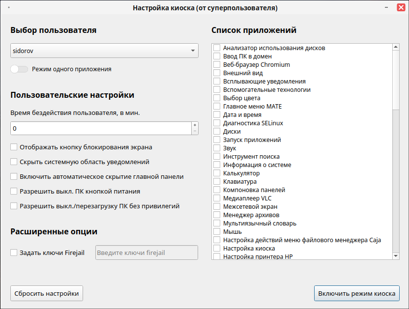 3. Включение режима киоска пользователю sidorov с разрешением запуска калькулятора MATE в "песочнице" с дополнительными опциями firejail (здесь --net=none):