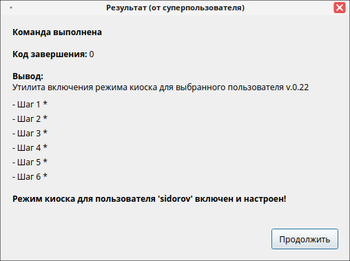 После активации режима киоска появится сообщение об успешной активации, нажмите «Продолжить»: