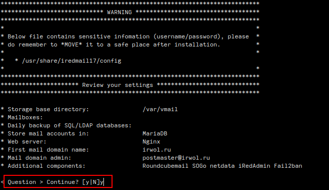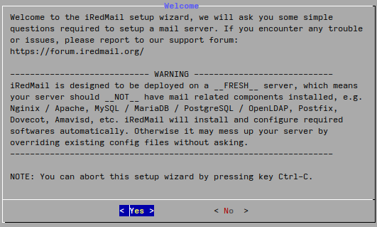Для запуска настройки iRedMail выберите Yes и нажмите Enter.