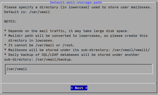 Укажите каталог для хранения почты. Можно оставить значение по умолчанию — /var/vmail. Нажмите Enter для продолжения.