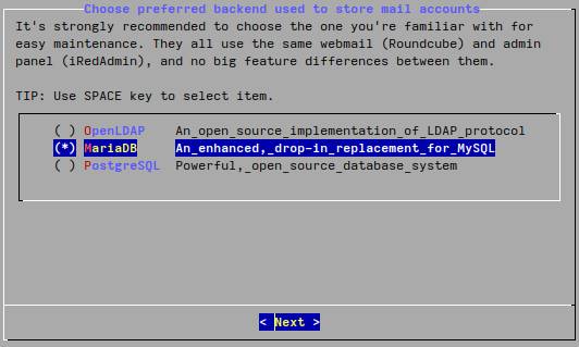 Выберите БД — MariaDB (для выбора нажмите клавишу Space). Нажмите Enter для продолжения.