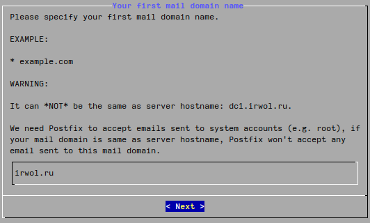 Укажите домен сервера — в рассматриваемом примере irwol.ru. Нажмите Enter для продолжения.