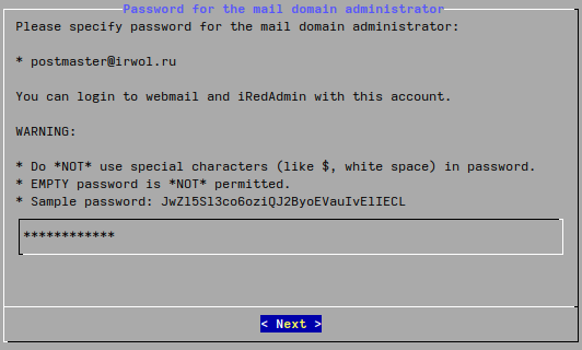 Задайте пароль для администратора почтового сервера. Нажмите Enter для продолжения.