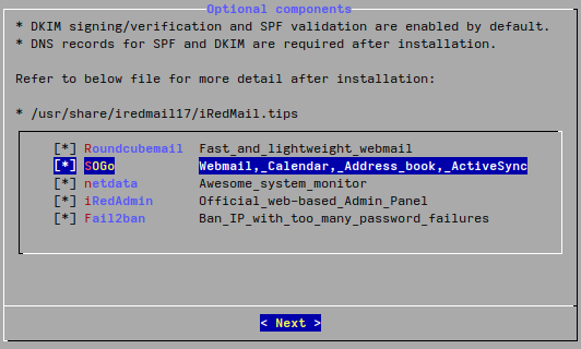 Выберите компоненты почтового сервера — необходимо выбрать все пункты (не выбранным по умолчанию является SOGo, его тоже необходимо включить). Нажмите Enter для продолжения.