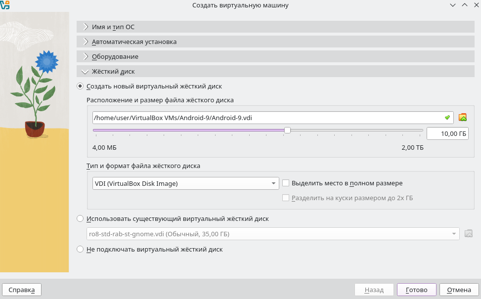 Создайте новый виртуальный жесткий диск. Объем жесткого диска рекомендуется задать не менее 8 ГБ. Если планируется устанавливать на Android приложения, необходимо выделить больше свободного места.