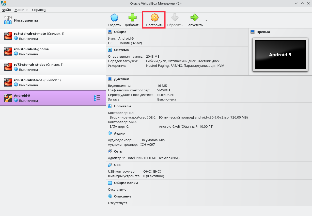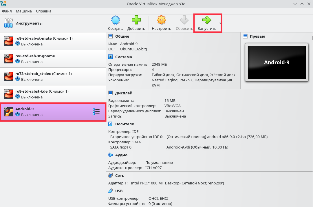 В VirtualBox Менеджере нажмите на кнопку «Запустить».