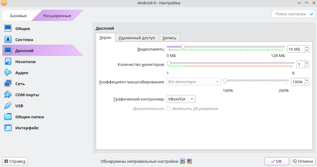 Затем перейдите в меню «Дисплей», установите видеопамять 16 МБ и выберите Графический контроллер «VboxVGA».