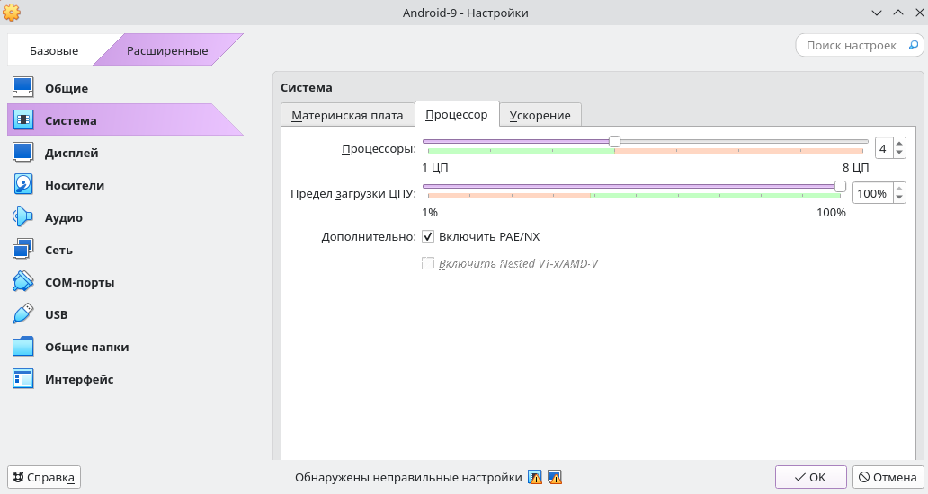 Зайдите в меню «Система» — «Процессор», установите 4 ядра процессора и активируйте PAE/NX.