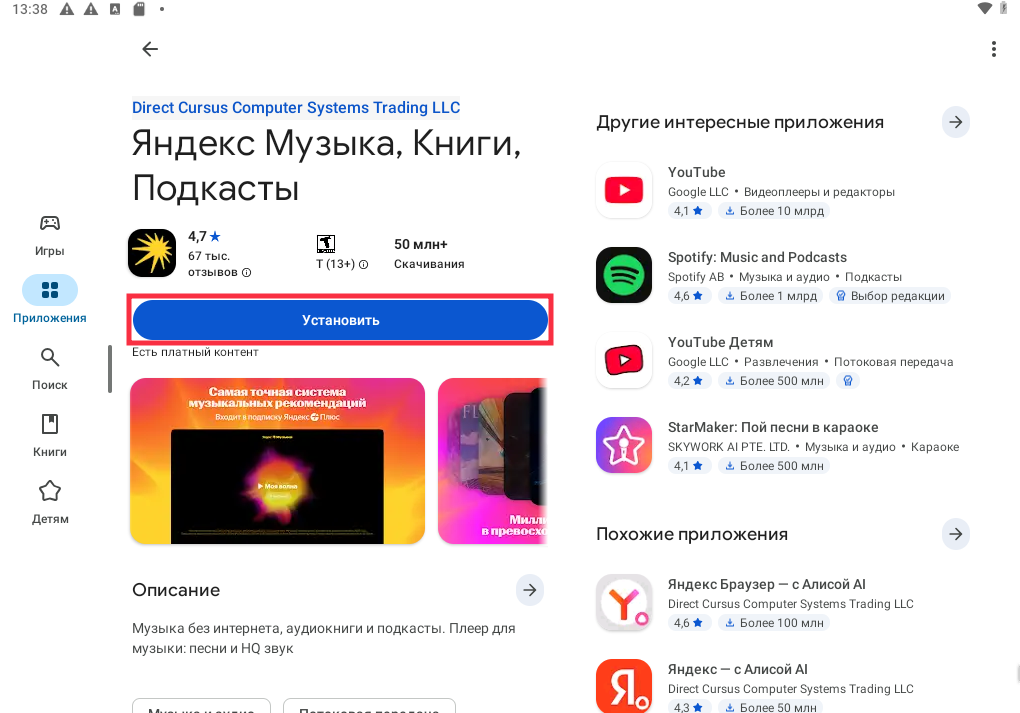 Зайдите в Play Market, выберите нужное приложение (например, «Яндекс Музыка, Книги, Подкасты»), нажмите «Установить».
