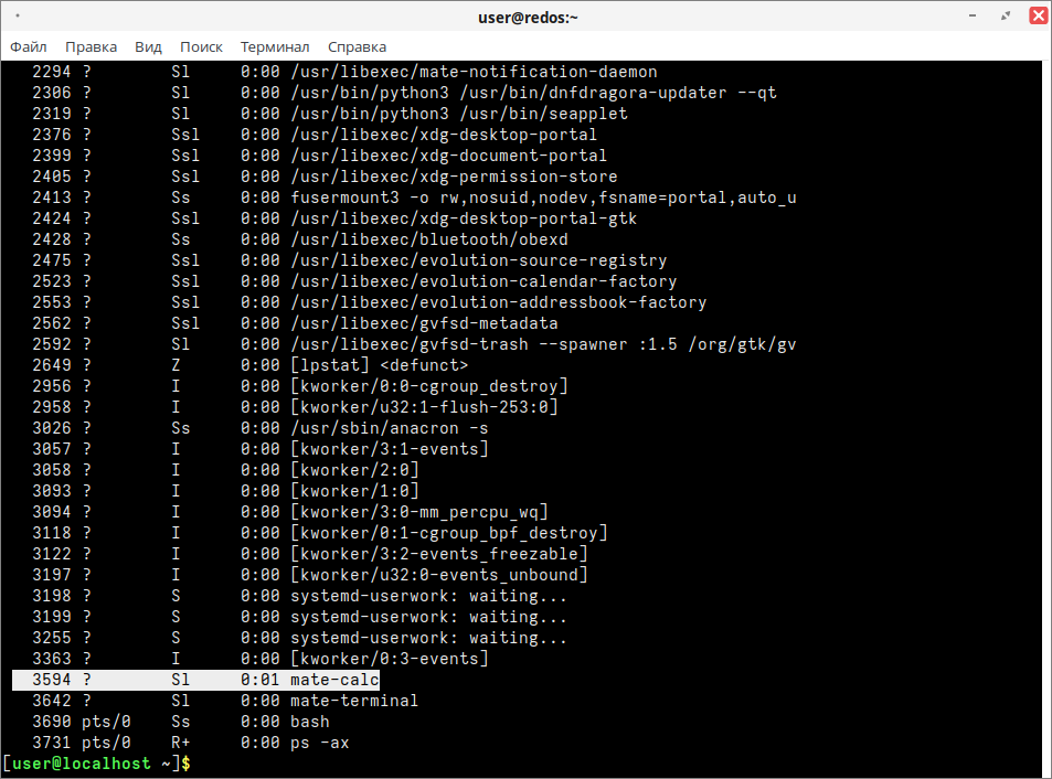 Для завершения какого-либо запущенного процесса используется утилита kill. В качестве аргумента утилите необходимо передать PID процесса, который можно уточнить с помощью описанных выше команд. Подробную информацию об использовании утилиты kill см. в нашей статье «Основные утилиты в консоли РЕД ОС».