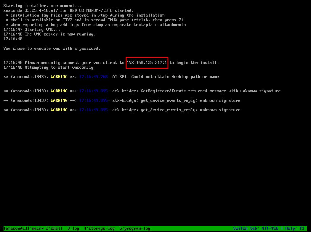 Параметры inst.vnc inst.vncpassword=password предоставляют возможность подключиться к установке по протоколу VNC, зная IP-адрес машины, порт и заданный пароль.