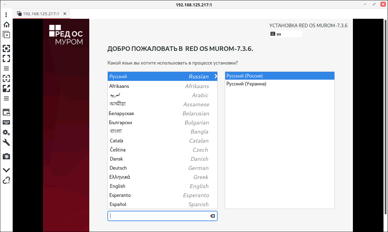 Если настройка выполнена верно, будет открыт сеанс VNC, в котором можно продолжить установку РЕД ОС.
