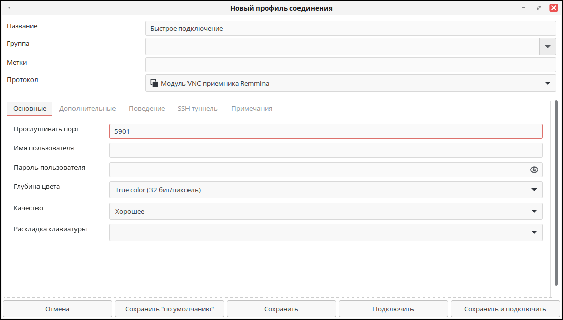 ), для поля «Протокол» выберите «Модуль VNC-приемника Remmina» и введите номер порта, на котором будет ожидаться запрос.