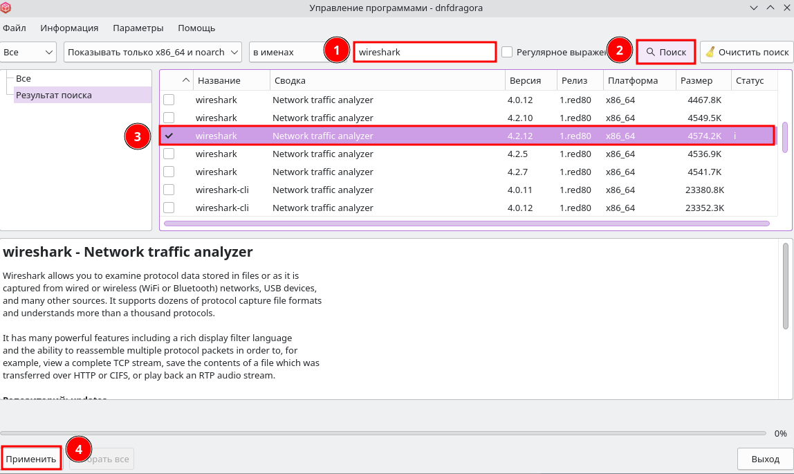 Для установки утилиты через графический менеджер пакетов dnfdragora перейдите в «Главное меню» — «Администрирование» — «Управление программами dnfdragora», выполните поиск необходимого пакета по ключевому слову «wireshark» и отметьте флагом пакет последней версии.