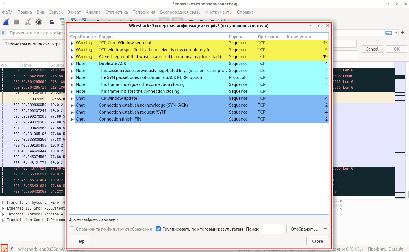 Wireshark позволяет находить и анализировать возможные причины сетевых неполадок и проблем с безопасностью. Утилита их обнаруживает и собирает в отдельное меню «Экспертная информация».