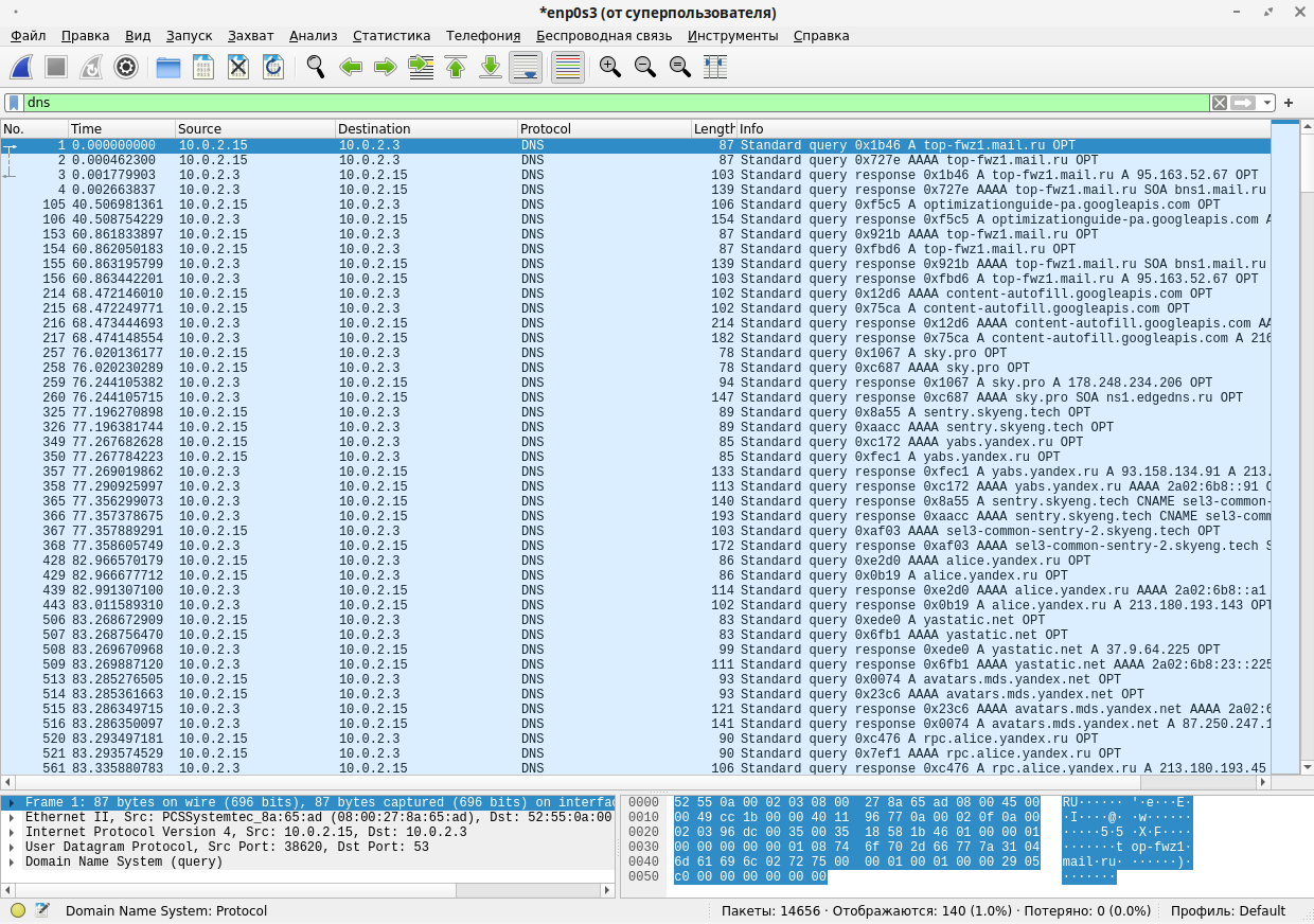 «Статистика» — содержит статистические данные, собираемые утилитой — разрешенные адреса, диалоги, длины пакетов, размер файла и средняя скорость захвата, иерархия протоколов, графики потока, время ответа сервисов и др.;