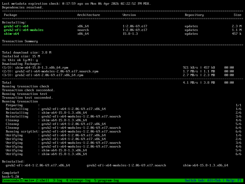В некоторых случаях при переустановке пакетов загрузчика может быть выведено сообщение вида «Package grub2-efi-x64-modules available, but not installed», свидетельствующее о том, что указанный пакет в системе ранее не был установлен. В таких случаях пакет (в данном примере grub2-efi-x64-modules) необходимо установить командой: