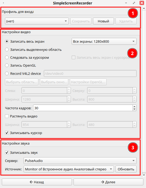 Первая страница SimpleScreenRecorder состоит из трех разделов: