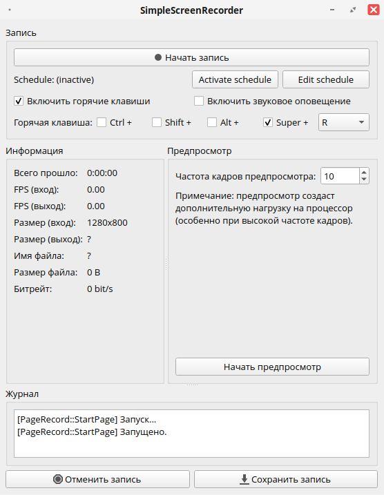 Запуск программы доступен из «Главного меню» — «Аудио и Видео» — «SimpleScreenRecorder» или через терминал командой (с правами непривилегированного пользователя):