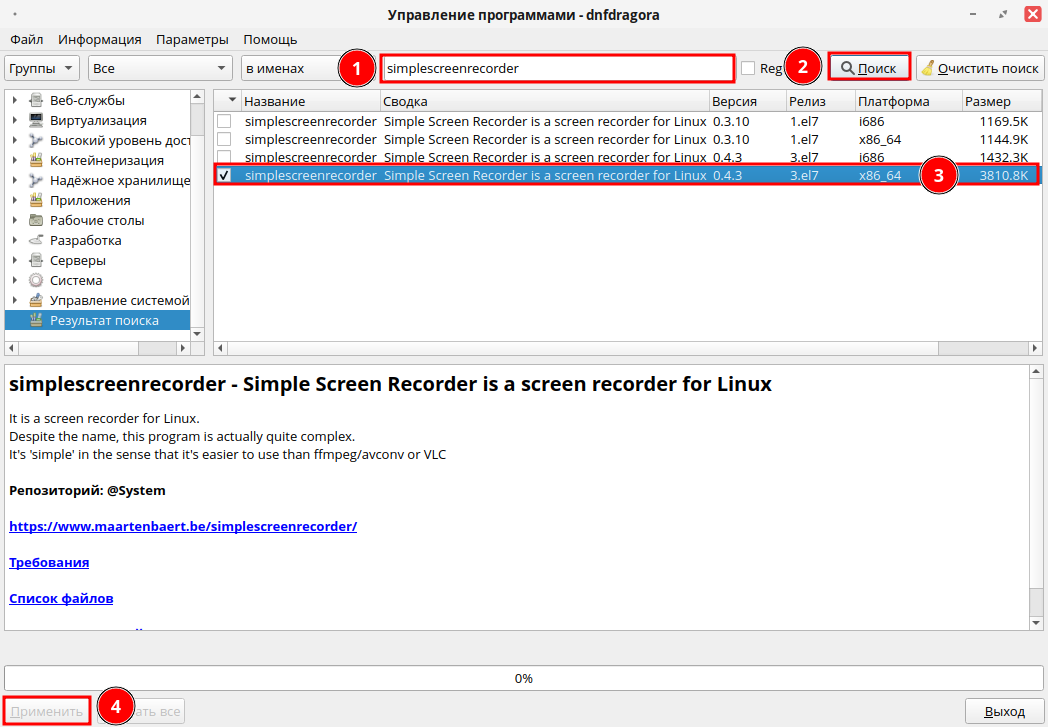 Для установки утилиты через графический менеджер пакетов dnfdragora перейдите в «Главное меню» — «Администрирование» — «Управление пакетами dnfdragora», выполните поиск необходимого пакета по ключевому слову «simplescreenrecorder» и отметьте флагом пакет последней версии. После этого нажмите кнопку «Применить» и дождитесь окончания установки.