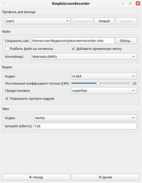 Первая страница SimpleScreenRecorder состоит из трех разделов: