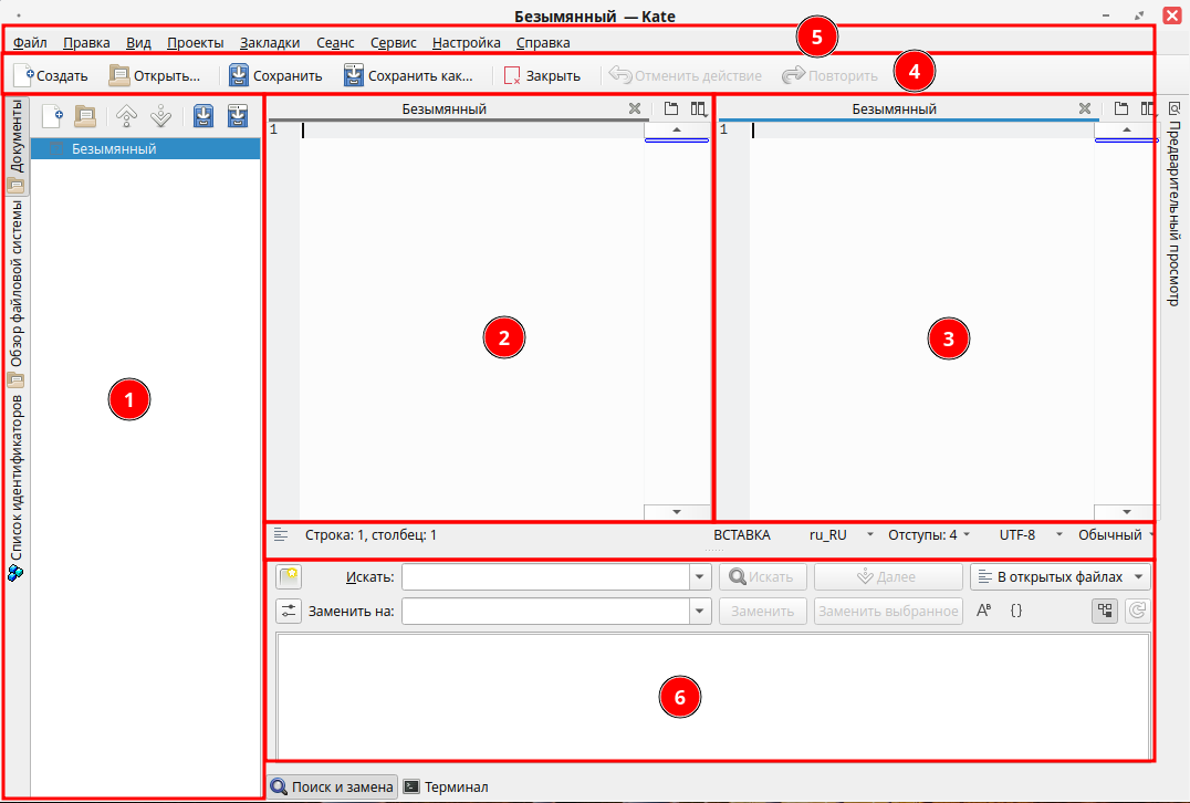 Левое окно (1) представляет собой Боковую панель с окном «Документы». Боковую панель возможно настроить, добавив модули («Обзор файловой системы» и «Просмотр идентификаторов»). Для настройки Боковой панели перейдите в меню «Настройка» - «Настроить Kate» - «Модули» - «Управление модулями».