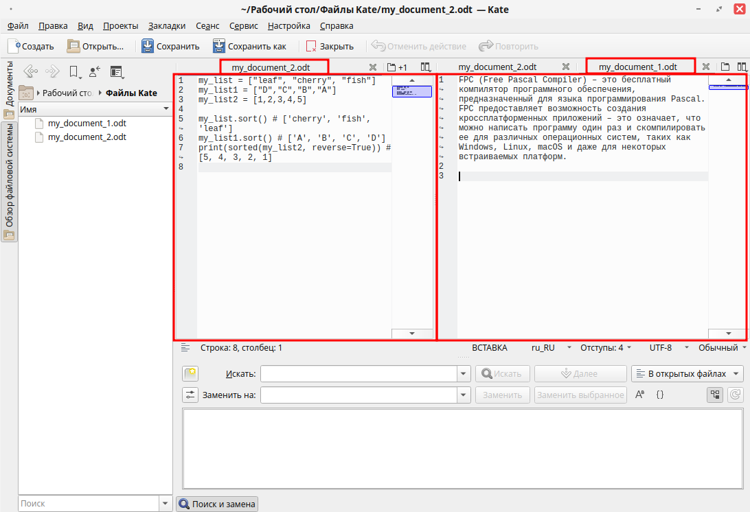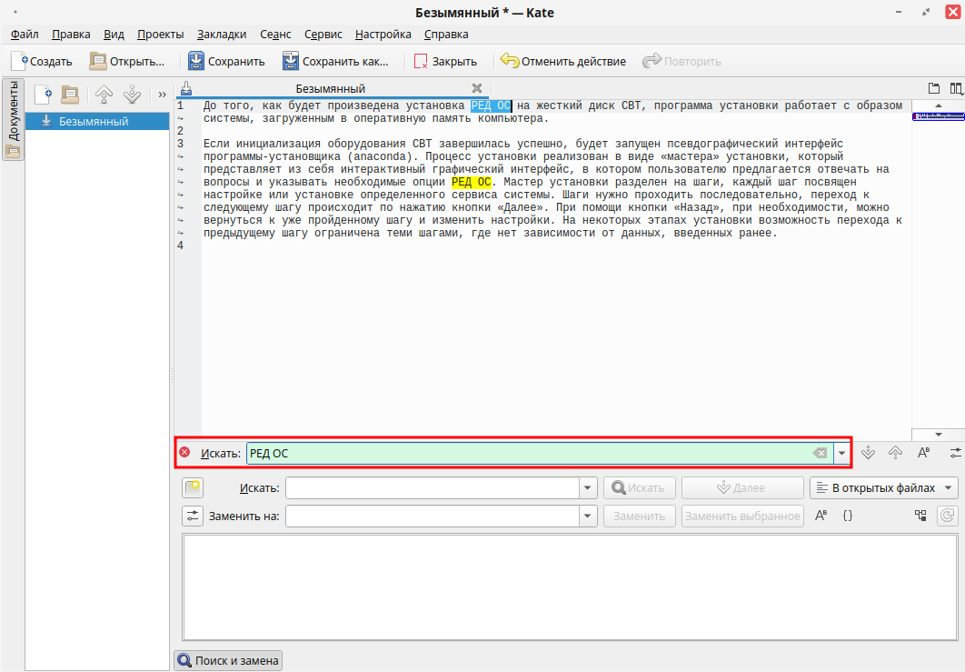 поиск - сочетание клавиш Ctrl + F и замена - сочетание клавиш Ctrl + R. При нажатии клавиш Ctrl + F в нижней части окна появляется строка «Искать» и при введении в нее искомых слов (например «РЕД ОС»), в тексте данные слова подсвечиваются. При нажатии клавиш Ctrl + R в нижней части окна появляется строка «Заменить на», в которую можно внести необходимую замену слов:
