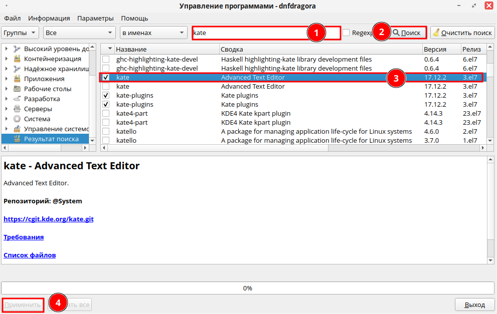 Для установки утилиты через графический менеджер пакетов dnfdragora перейдите в «Меню запуска приложений» - «Администрирование» - «Управление пакетами dnfdragora», выполните поиск необходимого пакета по ключевому слову «kate» и отметьте флагом пакет последней версии. После этого нажмите кнопку «Применить» и дождитесь окончания установки.