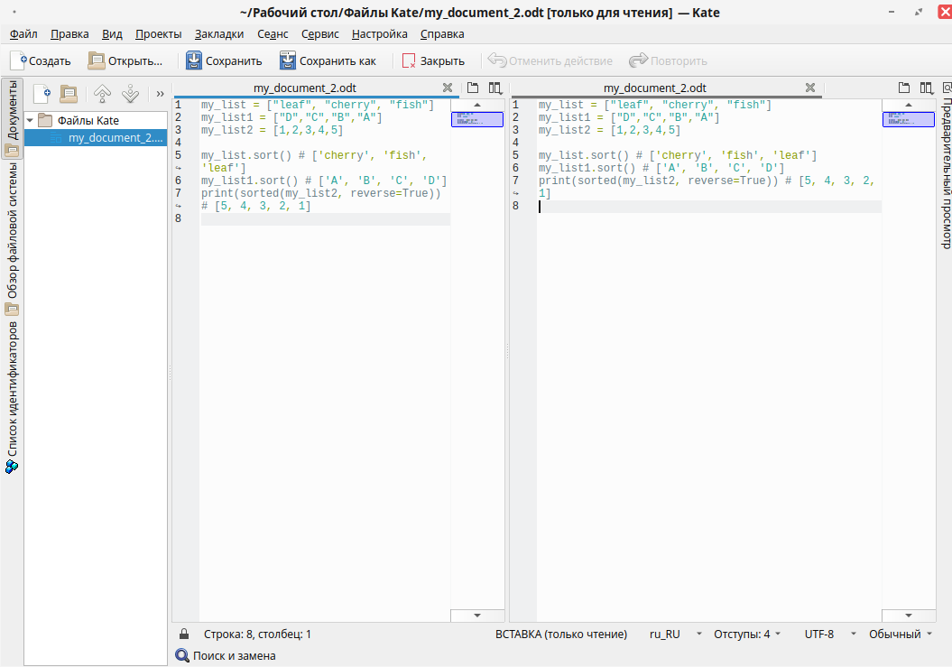 В правом окне - (2), (3) отображается редактируемый файл, а в разделе «Документы» на боковой панели - (1) - имя файла.