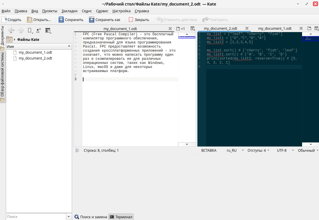 При запуске Kate с файлом на экране отображаются окна (слева - (1), справа – (2), (3)).