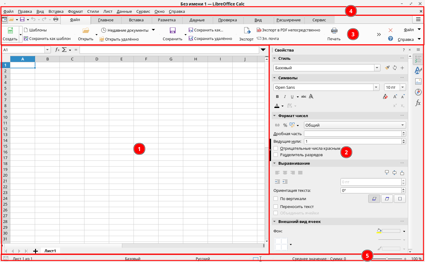 Над электронной таблицей располагается «Панель инструментов» (3), обеспечивающая быстрый доступ к основным функциям LibreOffice Calc: