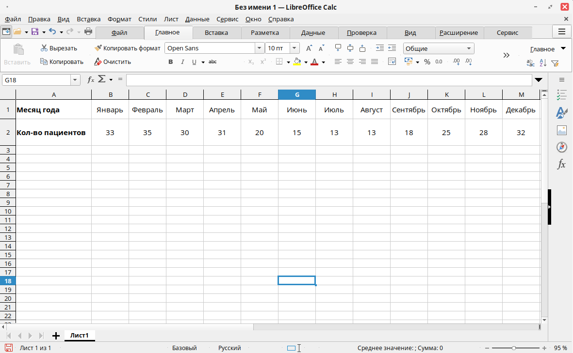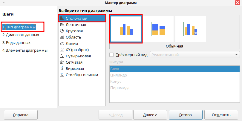 После редактирования параметров диаграммы нажмите кнопку «Готово». В окне LibreOffice Calc под таблицей данных появится автоматически созданная диаграмма:
