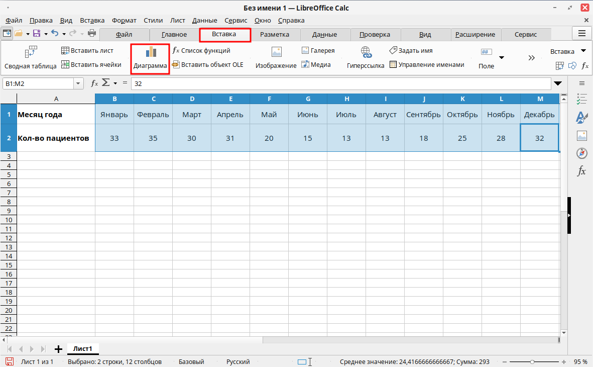 Для создания графика (например, той же зависимости заболеваемости ОРЗ от времени года) на основе данных той же таблицы выделите строки таблицы с данными и нажмите кнопку «Диаграмма» во вкладке «Вставка» на «Панели меню».
