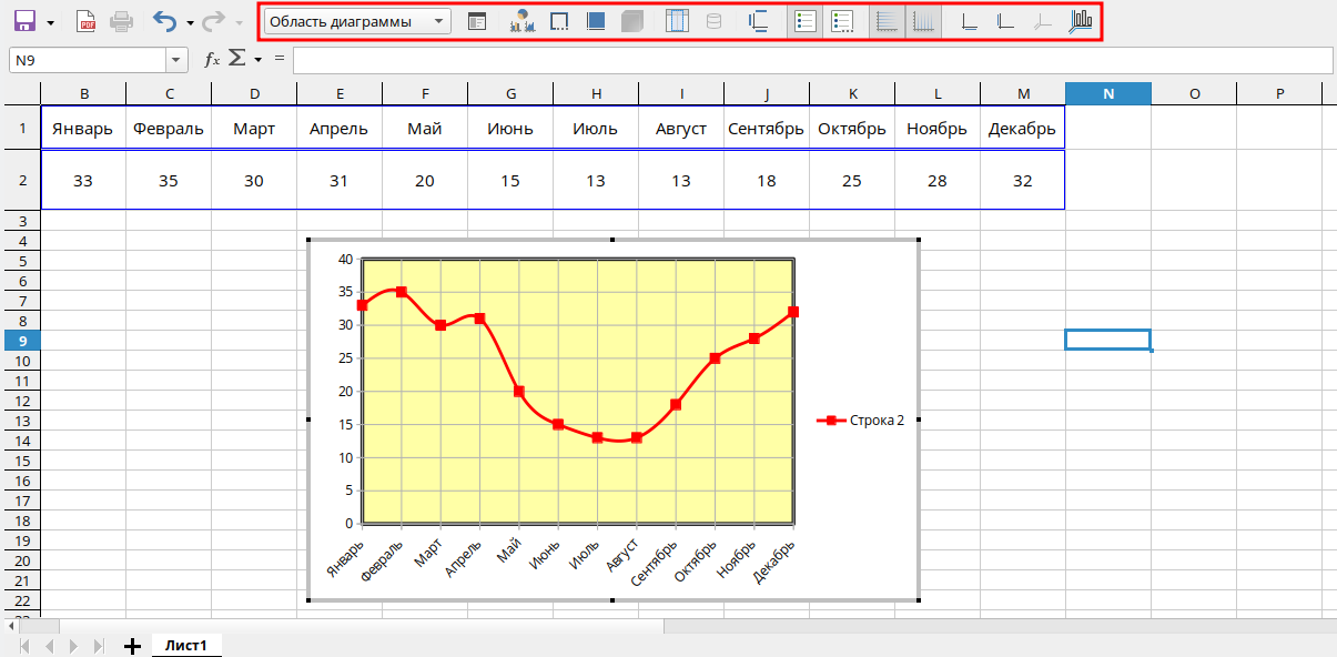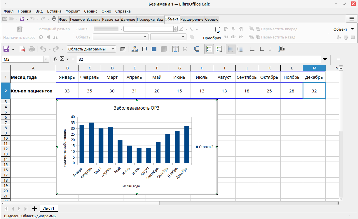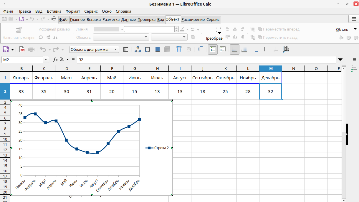 Для редактирования графика выделите объект двойным щелчком ЛКМ. Над рабочей областью окна LibreOffice Calc в «Панели инструментов» появится вкладка «Объект», содержащая следующие функции, которые позволяют: