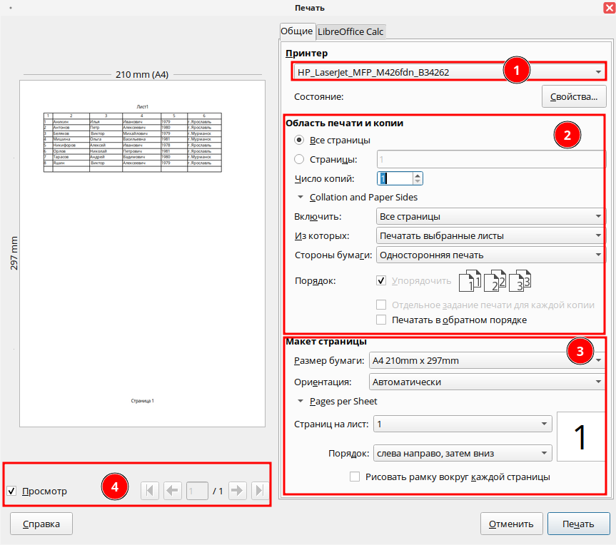 выбрать область для печати — печатать все листы, выбранные листы, выбранные ячейки;